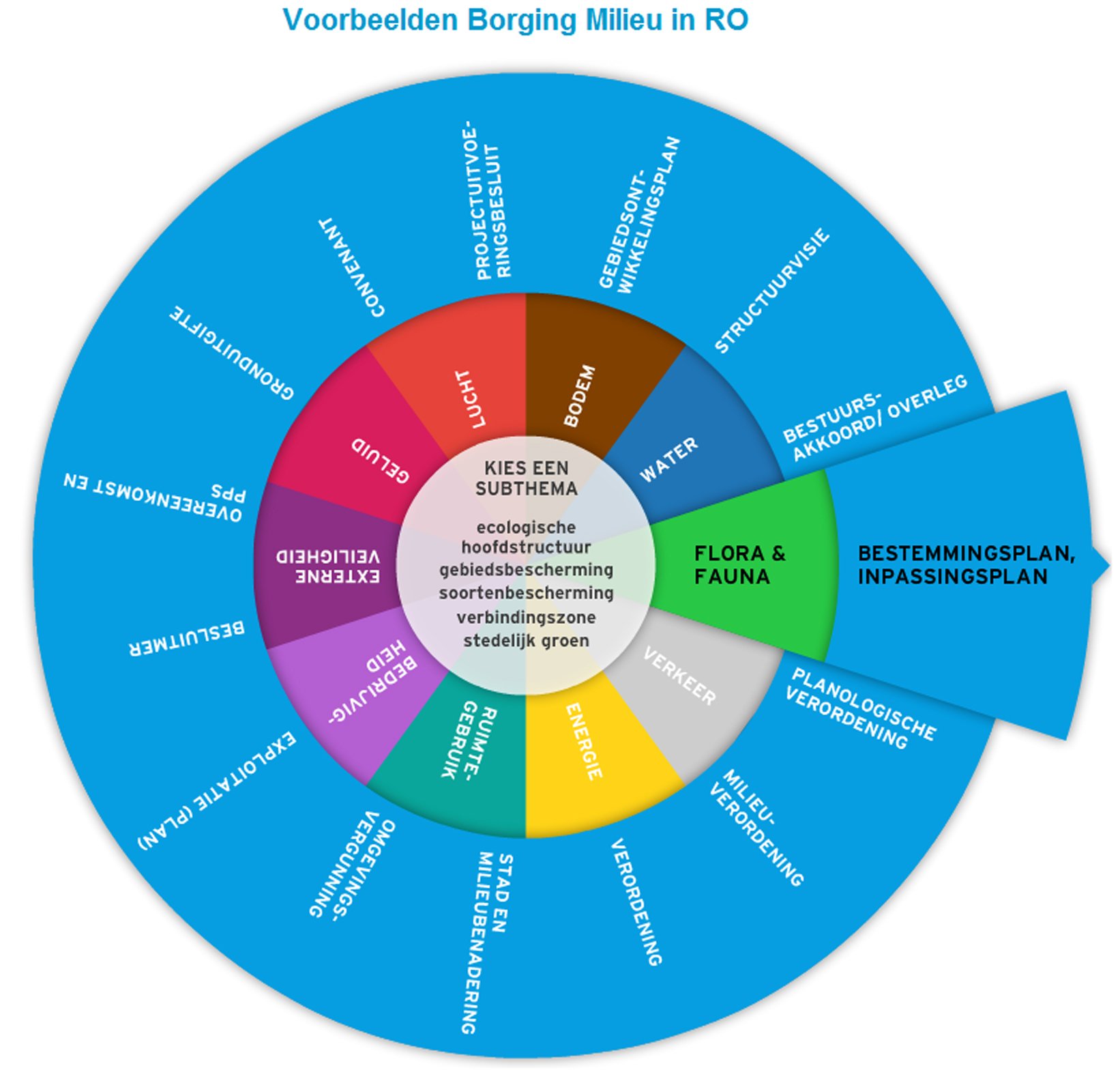De applicatie bevatte inspirerende voorbeelden van de borging van milieuaspecten uit de ruimtelijke praktijk van gemeenten en provincies. Zoekingangen waren het ruimtelijke instrument en/of het milieuthema. Door deze keuzes aan te klikken komen de geselecteerde praktijkvoorbeelden vanzelf in beeld. De voorbeelden bevatten letterlijke uitsneden van regels en toelichtingen daarop uit de planpraktijk.