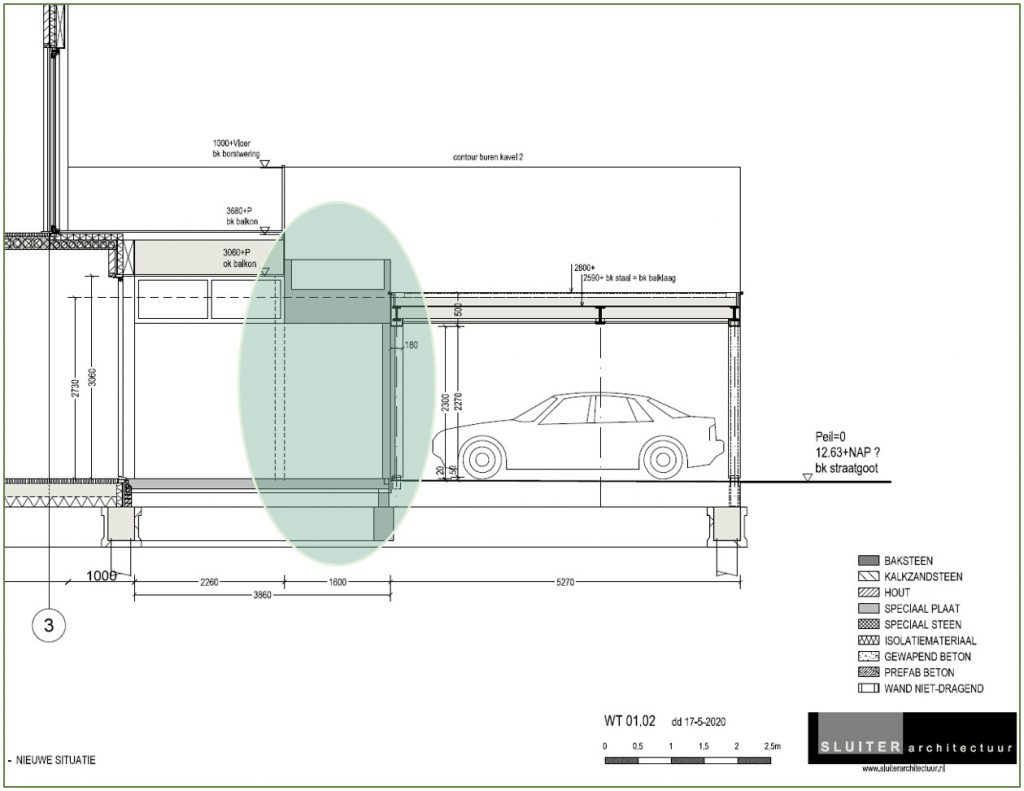 Door het hoogteverschil tussen het balkon en het lager gesitueerde groendak te gebruiken, zagen we een cascade ontstaan: water dat trapsgewijs van een hoogte naar beneden valt. Tussen het balkon, waar het hemelwater van de woning zich verzameld, en het bestaande groendak hebben wij daarom een tweede groendak met waterbuffer geplaatst. Deze groenbak bevat een waterbuffer (1,4m breed x 2,15m lang x 0,5m hoog = 1.505 mm/m2) bestaande uit een drainagesysteem, een waterreservoirplaat en een substraatlaag, met erop een forse groene heg.