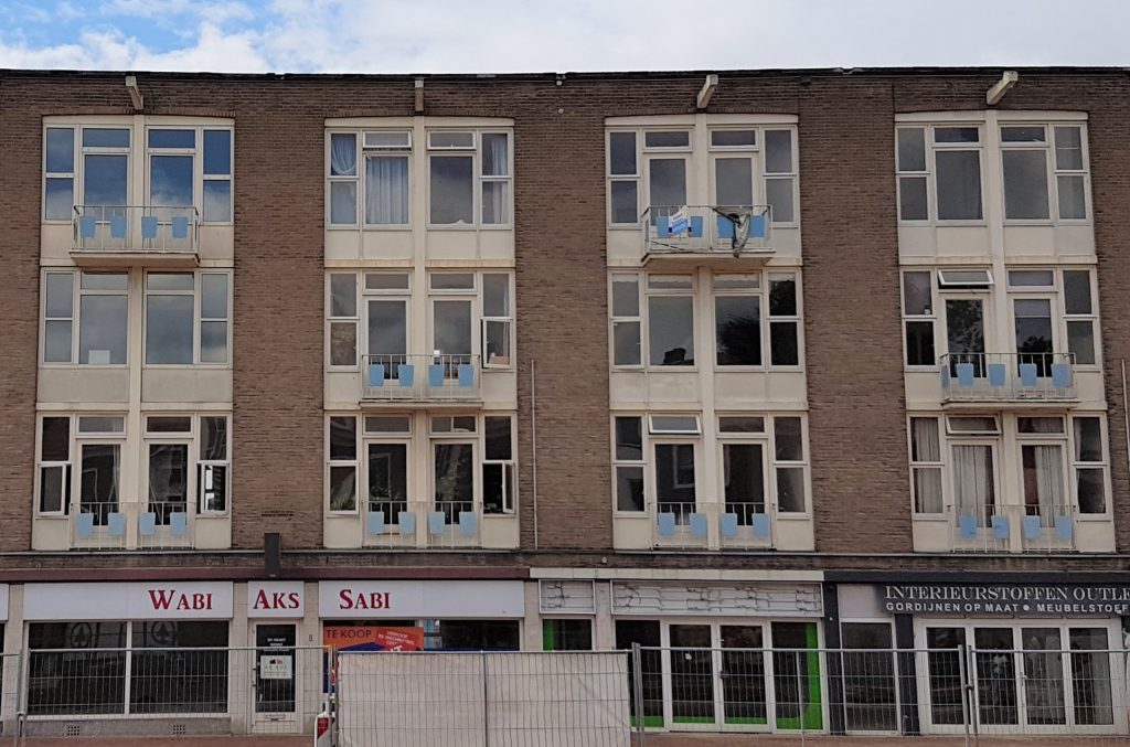 Tijdens onze bouw begon men met de sloop van de wederopbouwflat aan de Turfstraat. Ons vielen de kenmerkende metalen balkonhekwerken van deze flat al eerder op. Na een bouwoverleg waarin de hekwerken voor onze balkonnen op de agenda stonden, viel het kwartje. Waarom vragen we de slopers niet of wij enkele van de oude hekwerken kunnen afnemen? De medewerkers van sloopbedrijf Putman vonden het geen probleem om een drietal hekwerken met een shovel bij ons af te leveren, in plaats van in de oud ijzer container. Tegenprestatie: 2 Droom appeltaarten!